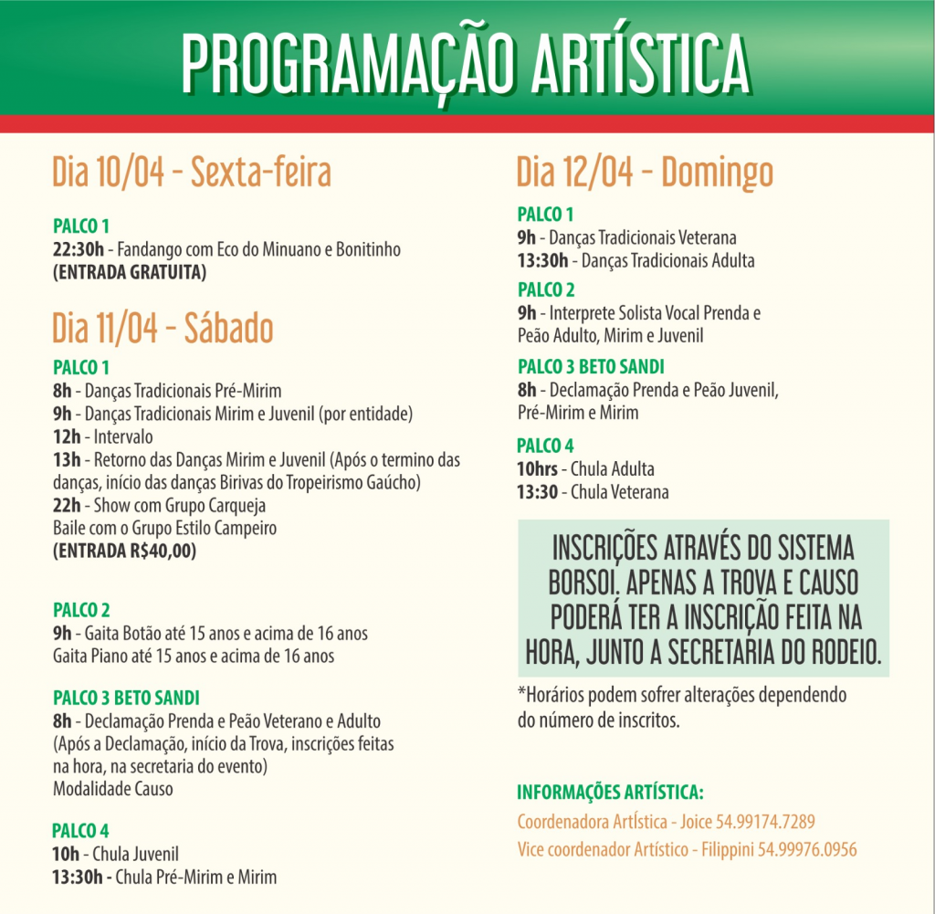 15º – As apresentações das Invernadas Artísticas no sábado dia 12/04/2025 será, por Entidade sendo Pré-Mirim, Mirim e Juvenil após Biriva. Já no domingo dia 13/04/2025, será por categoria, iniciando com a categoria Veterana as 9hrs da manhã e a categoria Adulta na parte da tarde, iniciando as 13:30hrs.